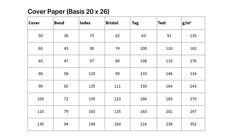 Below the paper weight charts display the equivalent basis weight between paper types and corresponding g/m2