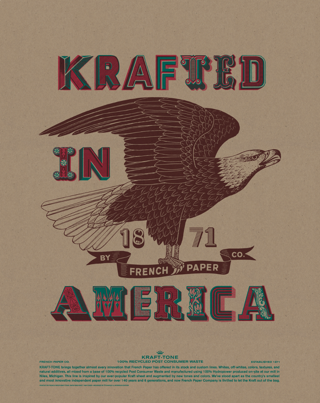 KRAFT-TONE brings together almost every innovation that French Paper has offered in its stock and custom lines: whites, off-whites, colors, textures, and natural additives, all mixed from a base of 100% recycled Post Consumer Waste and manufactured using Hydropower produced on-site at our mill in Niles, Michigan. This line is inspired by our ever-popular Kraft sheet and augmented by new tones and colors. We’ve stood apart as the country’s smallest and most innovative independent paper mill for over 140 years.