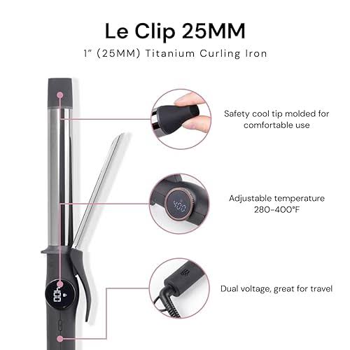 Curling Tongs by L'ANGE HAIR. Details:Lange Le Clip is a reimagined take on the classic curling iron, designed to be your everyday curler no matter your mood or style. It features a clipped 1 (25mm) titanium barrel and modern features like a large digital display, adjustable heat (280°-400°F), smart styling temperature memory, safety cool tip, and more. Plus, it comes in a gorgeous special-edition, limited-run primrose hue.